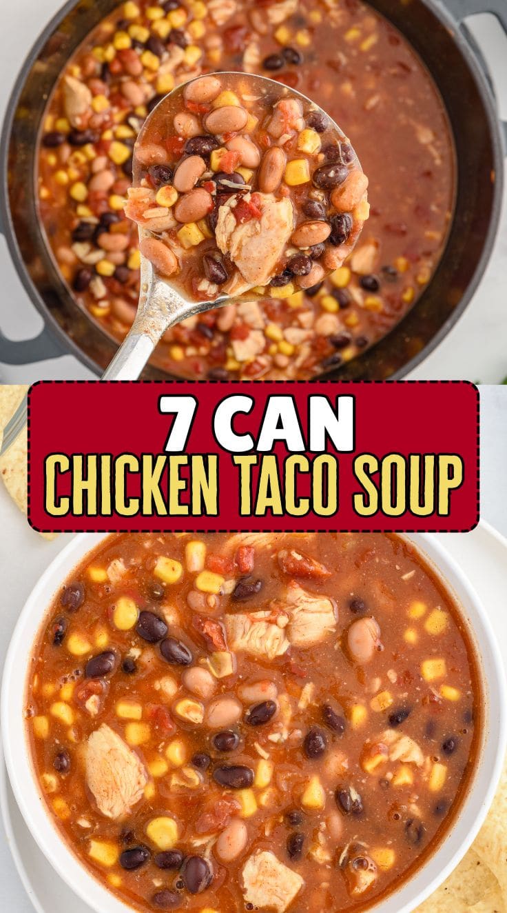 A 7 Can Chicken Taco Soup is the easiest and fastest way to make a hearty meal out of everything from your pantry – no freezer or fridge items are needed! Filled with chicken, vegetables, beans, and plenty of spices, this flavorful dish is both delicious and nutritious.