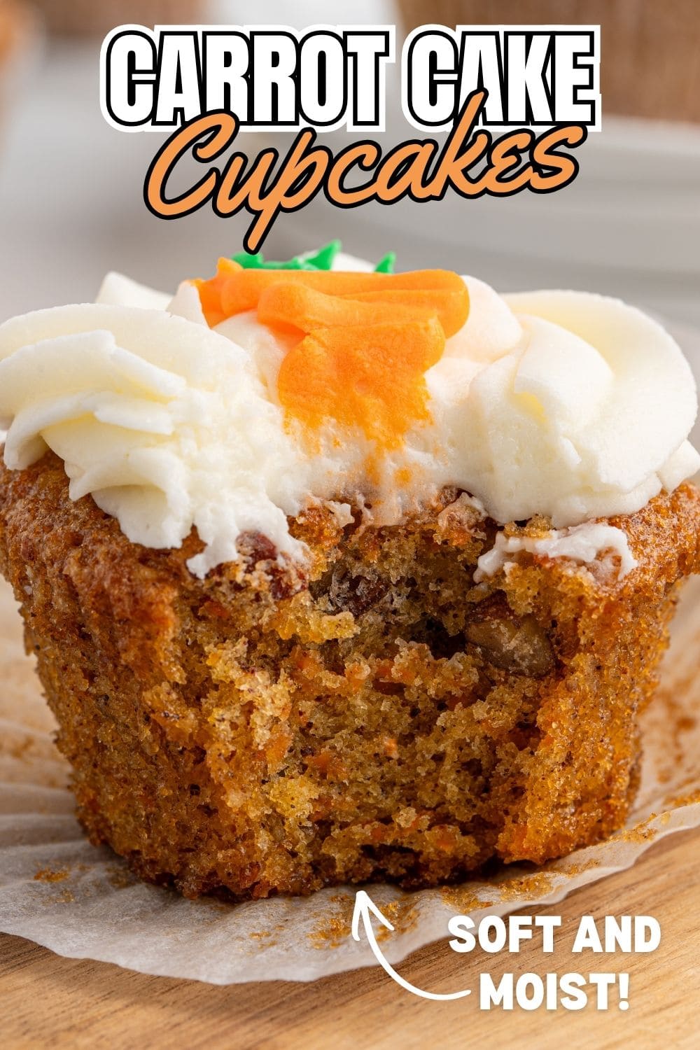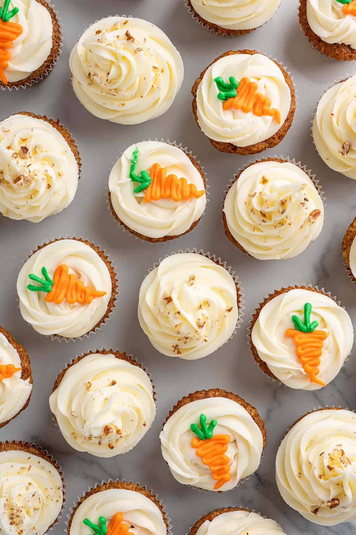 - Transfer the frosting to a large piping bag, fitted with a decorative tip, and pipe the frosting onto each of the cooled carrot cake cupcakes. Note: If making decorative piped carrots for garnish, reserve ¾ cup of the frosting before adding to the large piping bag. You will also need to pipe the frosting onto the cupcakes in a flat pattern, not a tall swirl.