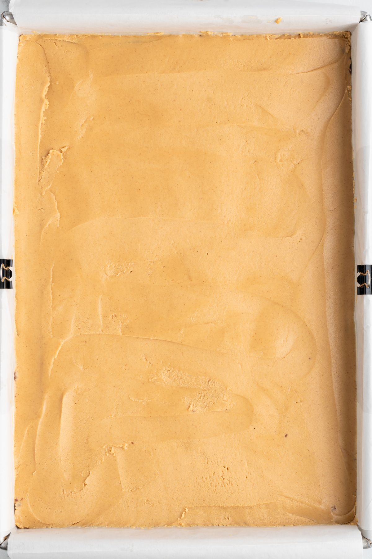 - Immediately after removing the brownies from the oven, drop spoonfuls of the peanut butter filling over the top of the hot brownies. Use a spoon or an offset spatula to carefully spread the peanut butter filling.