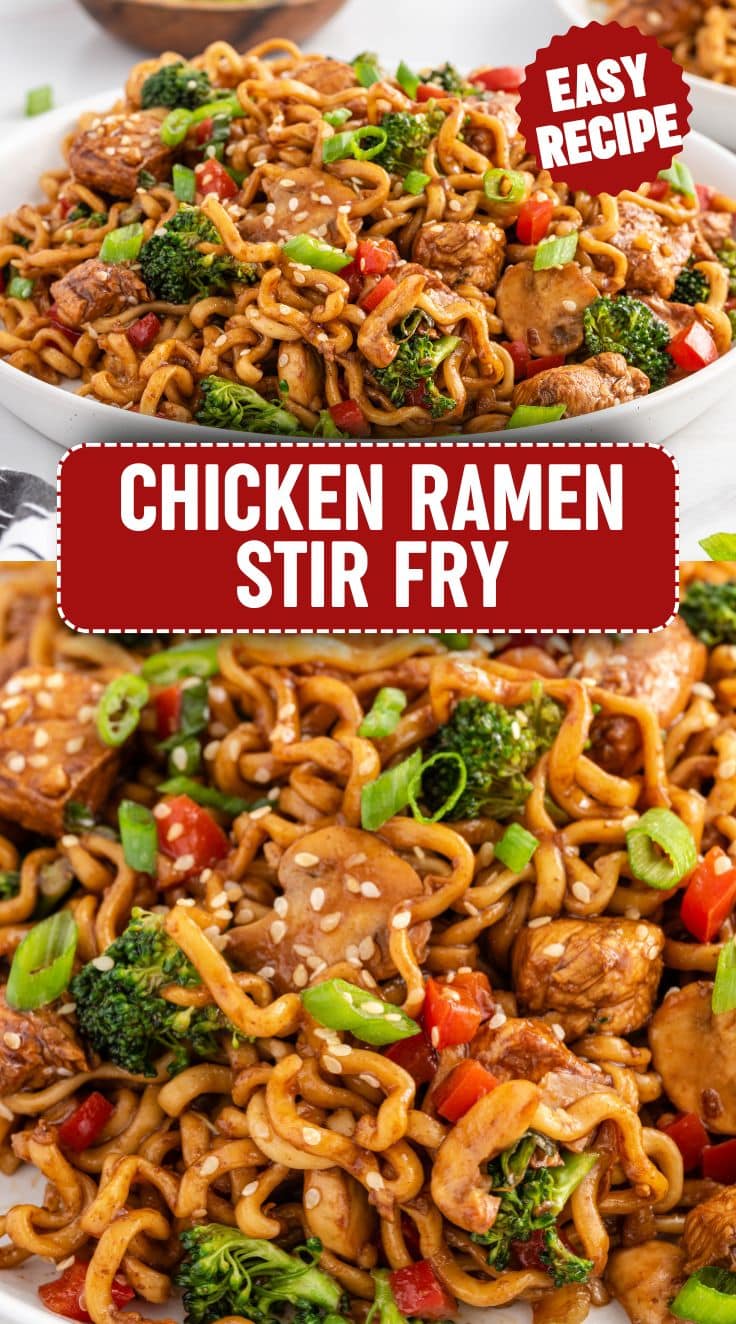 Chicken Ramen Stir Fry is an easy and delicious dinner, perfect for those busy weeknights. Loaded with crisp vegetables and chicken simmered in a flavorful, savory sauce and served over ramen noodles, this dish is going to be a regular in your house!