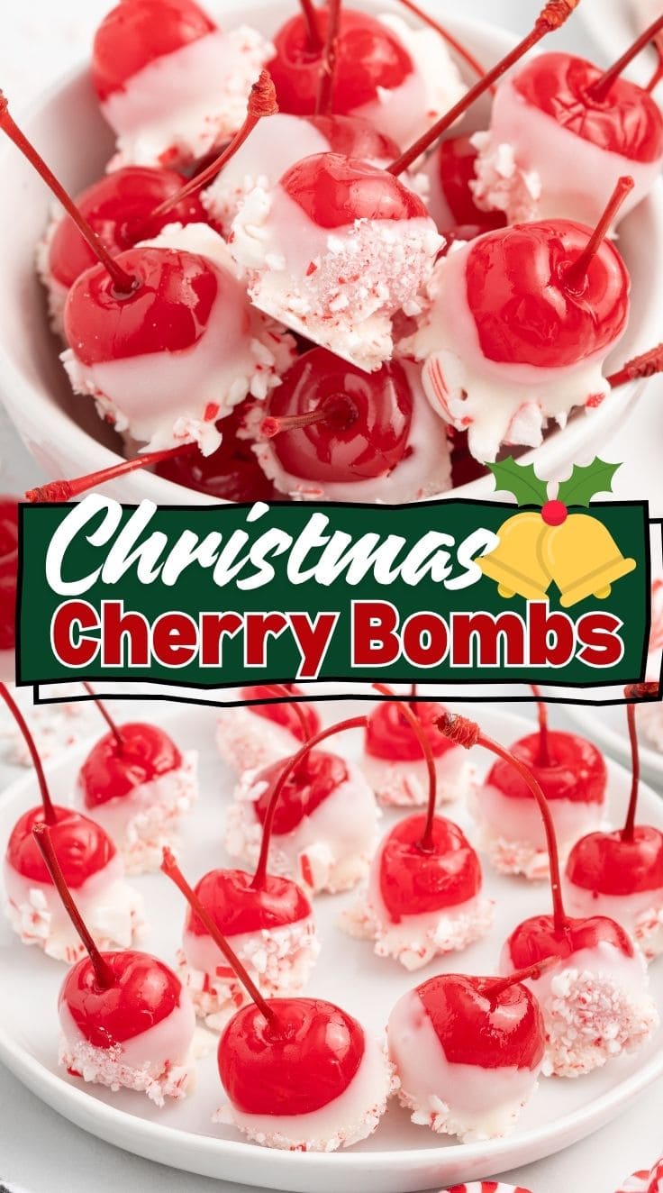 Christmas Cherry Bombs are always a hit with adults for the holiday season! Made with maraschino cherries soaked in peppermint schnapps, these boozy bites have a white chocolate and peppermint candy coating and are festively flavored and decorated for Christmas.