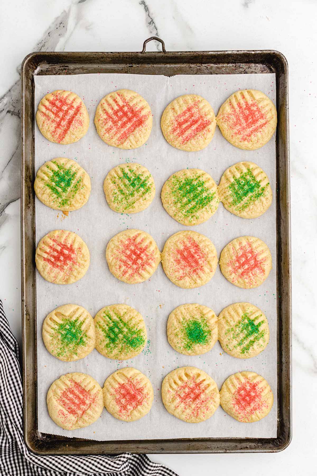 - Shape & decorate: Roll the dough into balls and place them on a parchment-lined baking sheet. Press lightly with a fork to make a criss-cross pattern, then sprinkle with red or green sanding sugar.