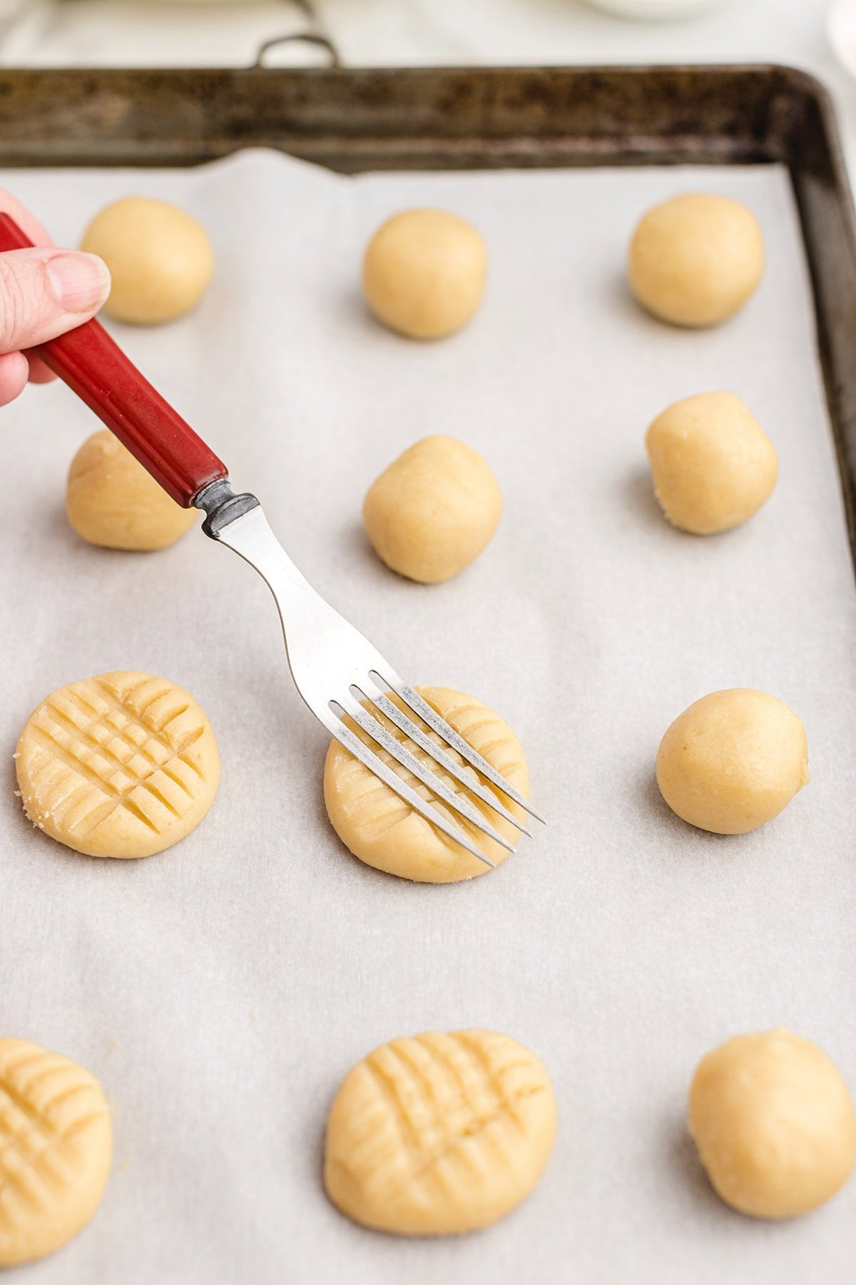 - Using a fork, make a criss cross pattern pressing down lightly into the cookie dough.