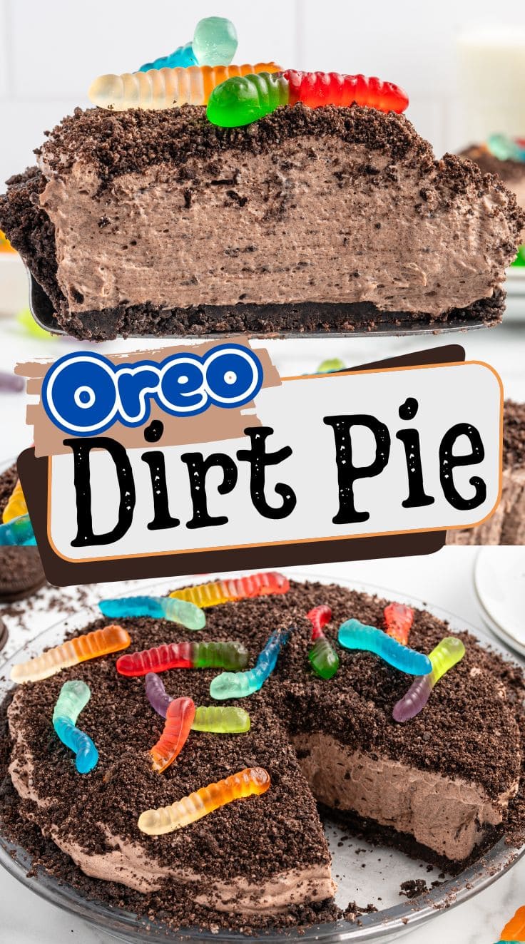 Get ready to dig into the best no bake Dirt Pie recipe, complete with Oreo cookie crust, creamy chocolate pudding filling, edible Oreo dirt, and gummy worm garnish. Always approved by kids and a classic family favorite.