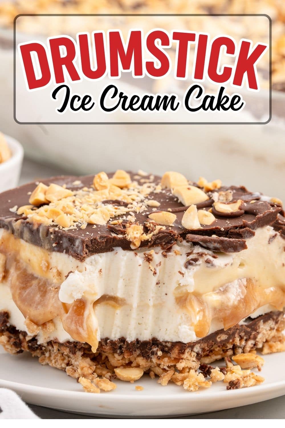 This drumstick ice cream cake is best served frozen. Remove the 9×13 dish from the freezer for 3-5 minutes to allow the ice cream to thaw just enough to slice and serve easily. Once sliced, serve the pieces immediately to prevent the ice cream from melting too much.