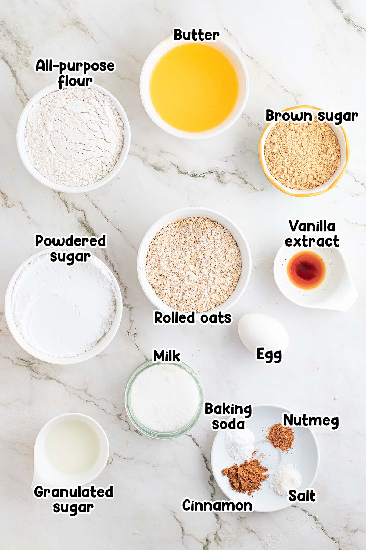 - In a bowl, whisk oats, flour, baking soda, cinnamon, nutmeg, and salt.1 cup all-purpose flour, ½ teaspoon baking soda, ½ teaspoon cinnamon, ¼ teaspoon nutmeg, ½ teaspoon salt