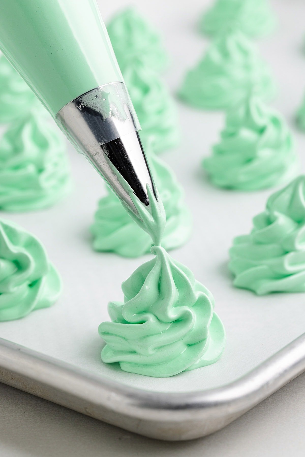 - Transfer the meringue to a piping bag fitted with a large star tip. (I used a Wilton 1M star tip). Pipe tall swirls in a tree shape onto the prepared baking sheets, spacing them about 1 inch apart.