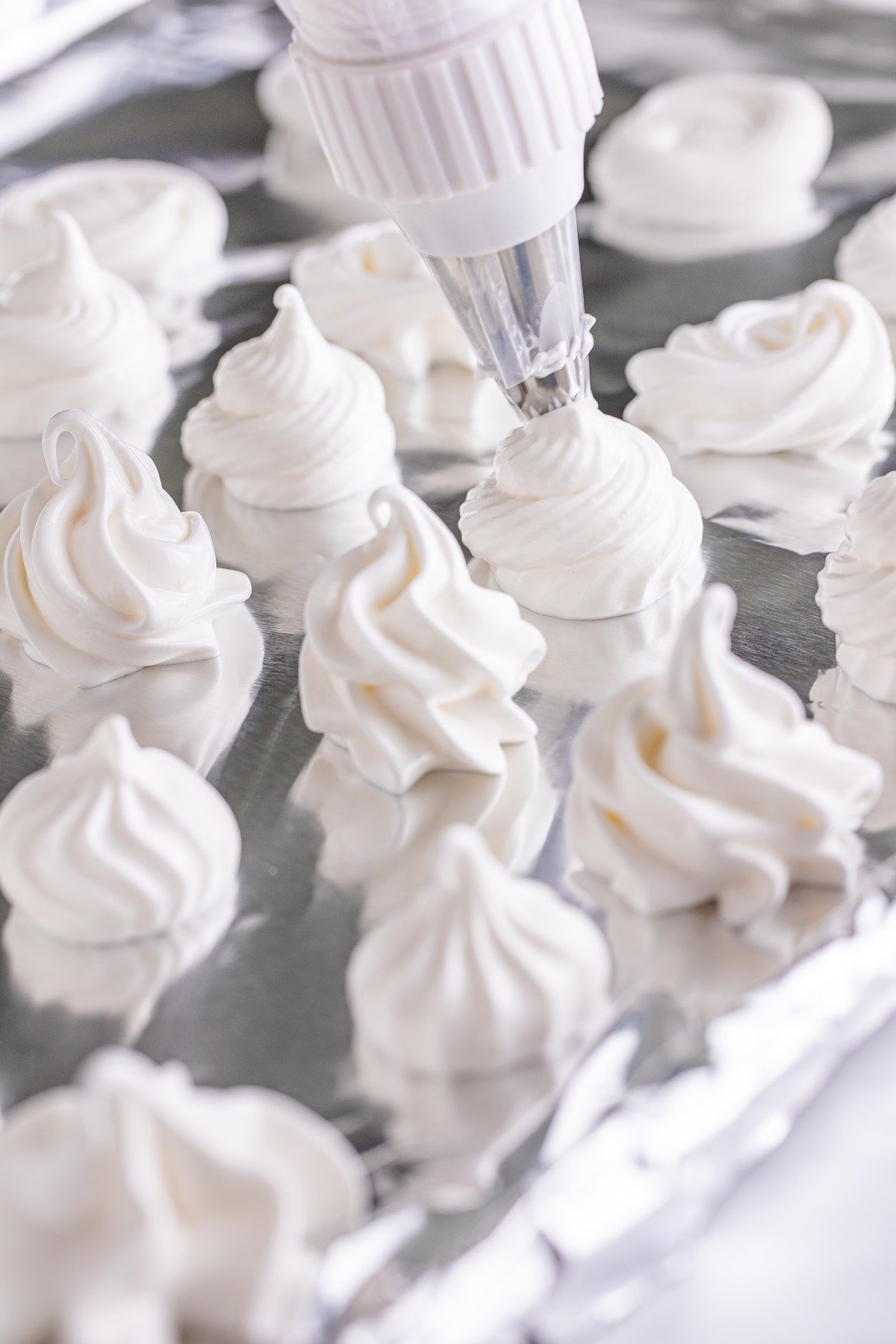 - Place the meringue into a piping bag and pipe shapes onto the foil that are similar in size, about 1 & ½ inches wide and up to 1 & ½ inches tall. You can pipe them about ½ inch apart as the cookies will not spread while baking.