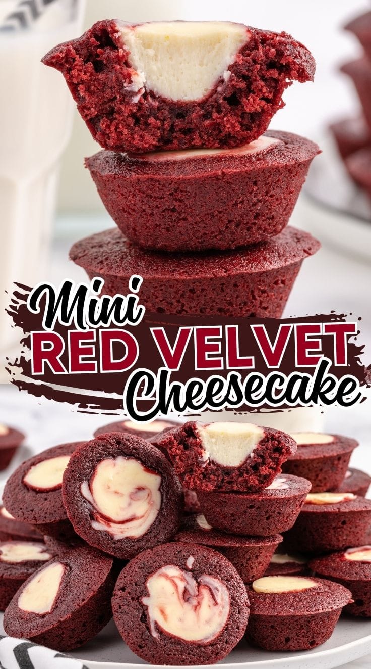 Mini Red Velvet Cheesecakes are filled with the same flavors as a full-sized cheesecake, but these bites have a moist, chewy brownie batter base that’s quickly baked with a creamy cheesecake mixture in the middle.