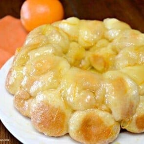 This Orange Monkey Bread is made with butter, sugar, biscuits, orange zest and fresh orange juice. You bite into a sweet and delicious citrus flavor with a surprise cream cheese center.