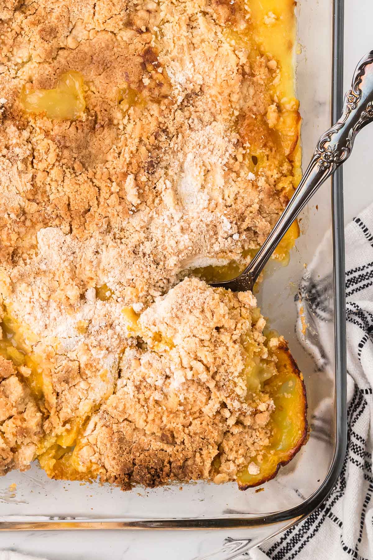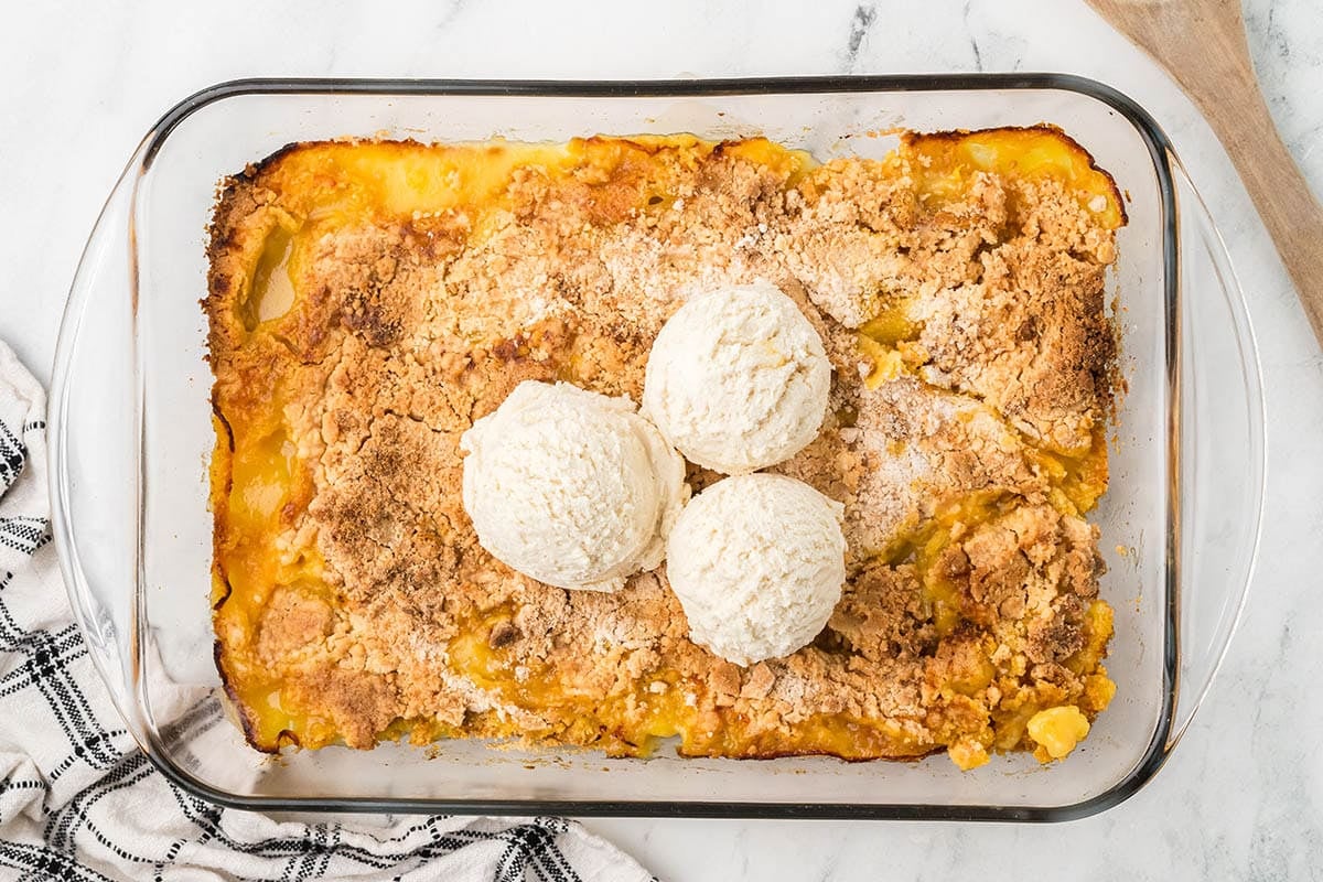 - If dry cake mix remains after baking, lightly mist those areas with extra melted butter or some reserved peach juice.
