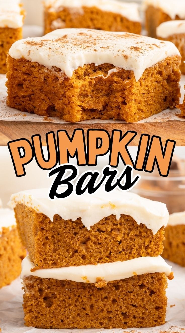 Pumpkin Bars are the perfect fall treat. Soft, moist, and topped with cream cheese frosting, this easy Fall dessert packs plenty of sweetly spiced seasonal flavor in every soft and slightly chewy bite.