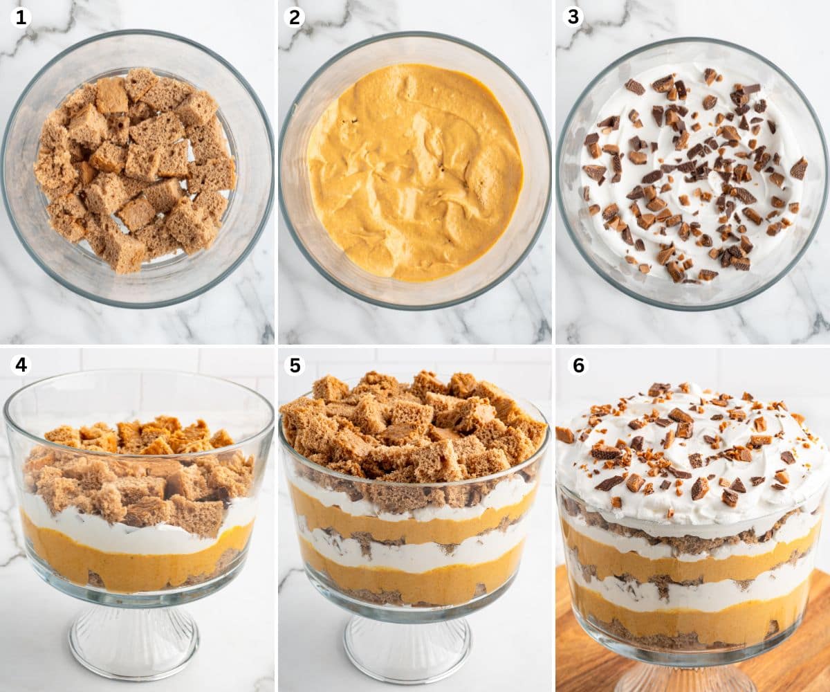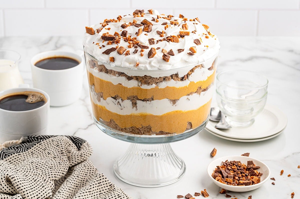 - Layer the trifle: Add a layer of cake cubes to the bottom of the trifle bowl. Spoon half of the pumpkin filling over the cake and cover with half of one container of whipped topping. Sprinkle with chopped pecans and toffee bits.