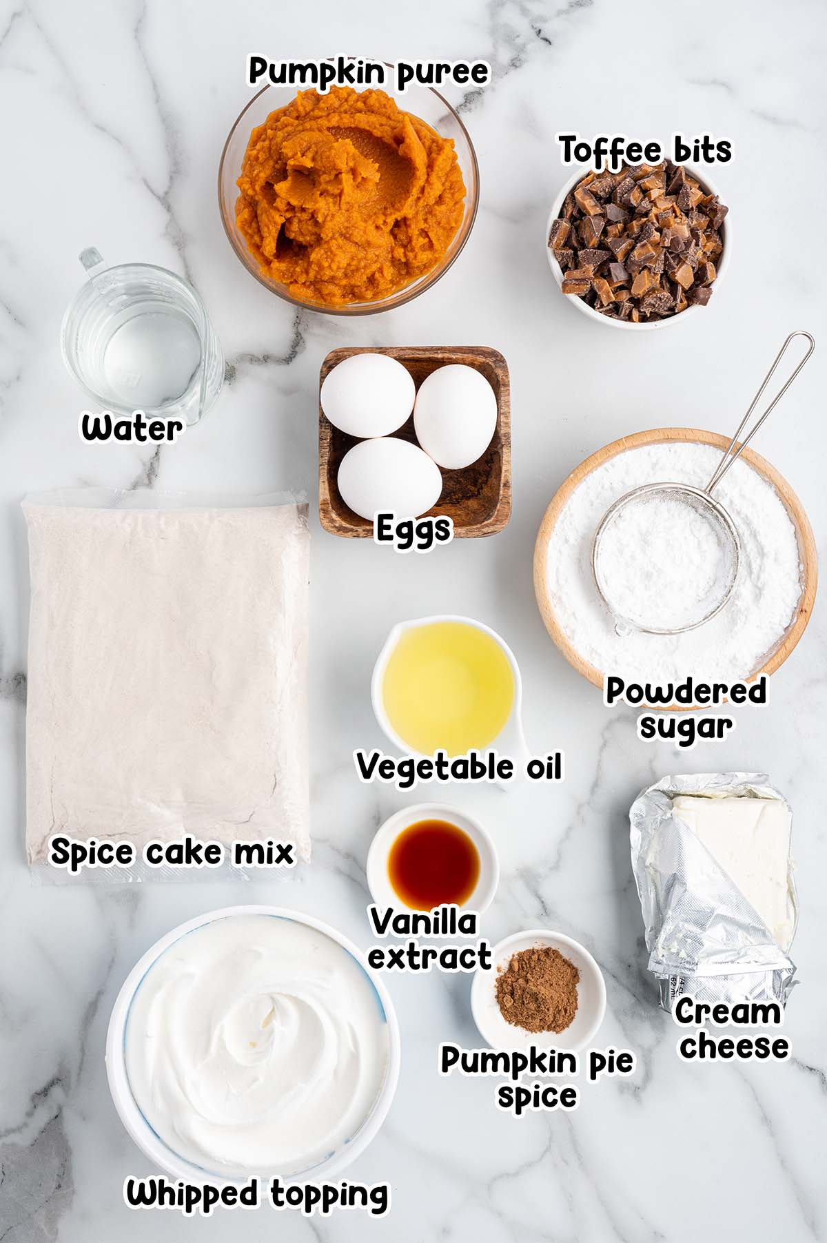 - Spice cake mix – You can substitute with vanilla cake or pound cake if preferred. To switch things up, try using gingerbread cake or cookies for a pumpkin and gingerbread trifle variation.