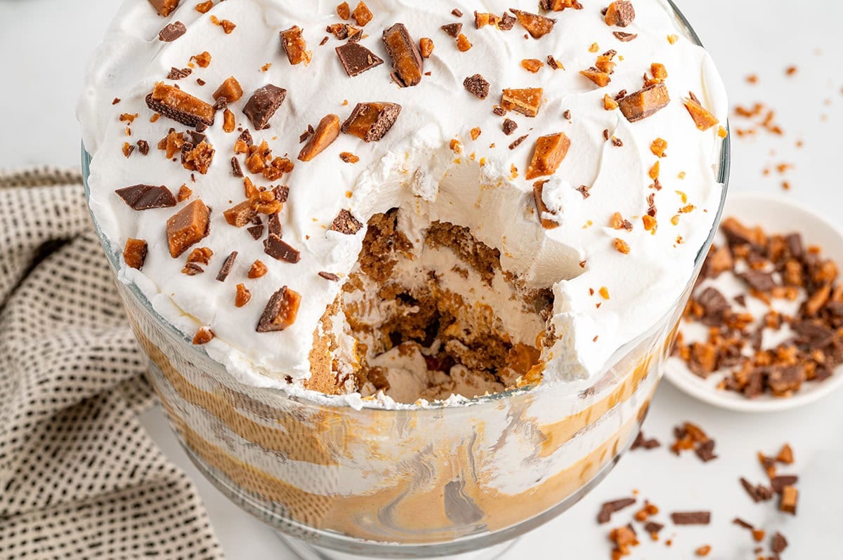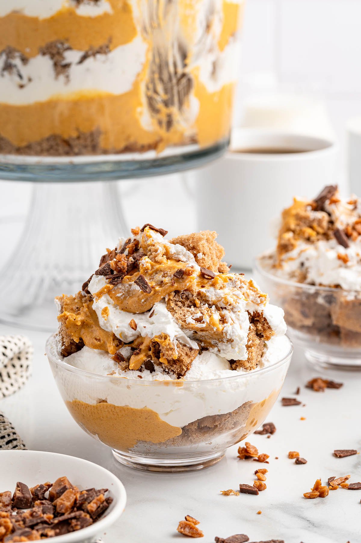 - Make Ahead: You can assemble the trifle up to 1 day in advance. Keep it covered or in an airtight container in the refrigerator. For the best texture, add final garnishes like pecans or toffee bits just before serving.