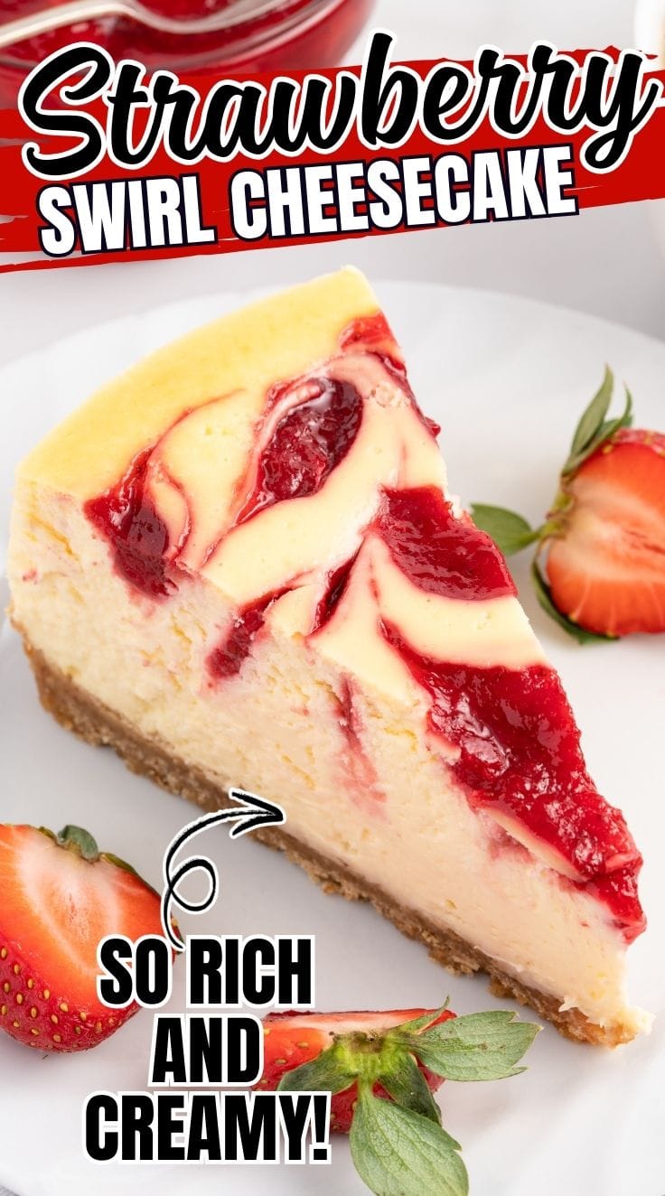 - Rich, creamy cheesecake with a sweet strawberry swirl in every slice.
