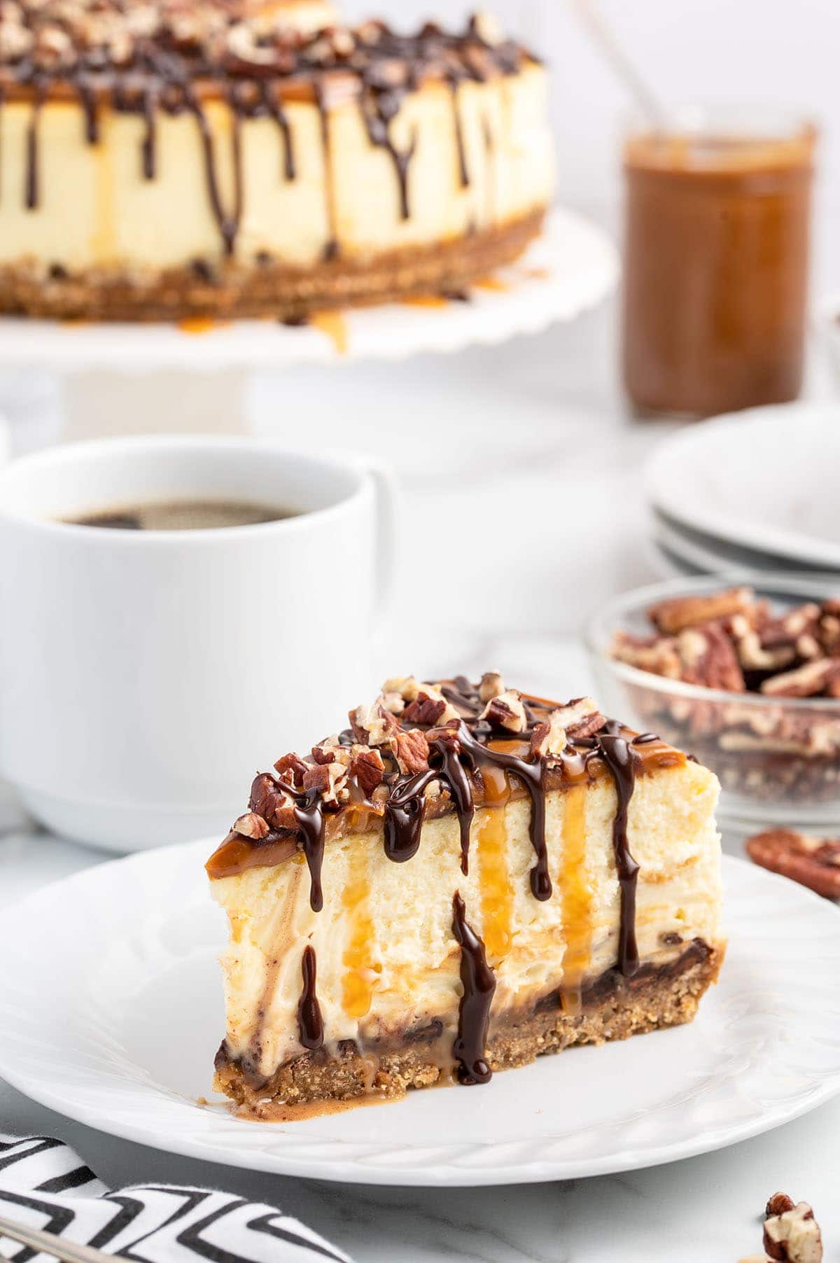 - Top and serve: Warm dulce de leche with heavy cream and stir until smooth. Spread over the cheesecake, drizzle with chocolate syrup, and sprinkle chopped pecans before serving.