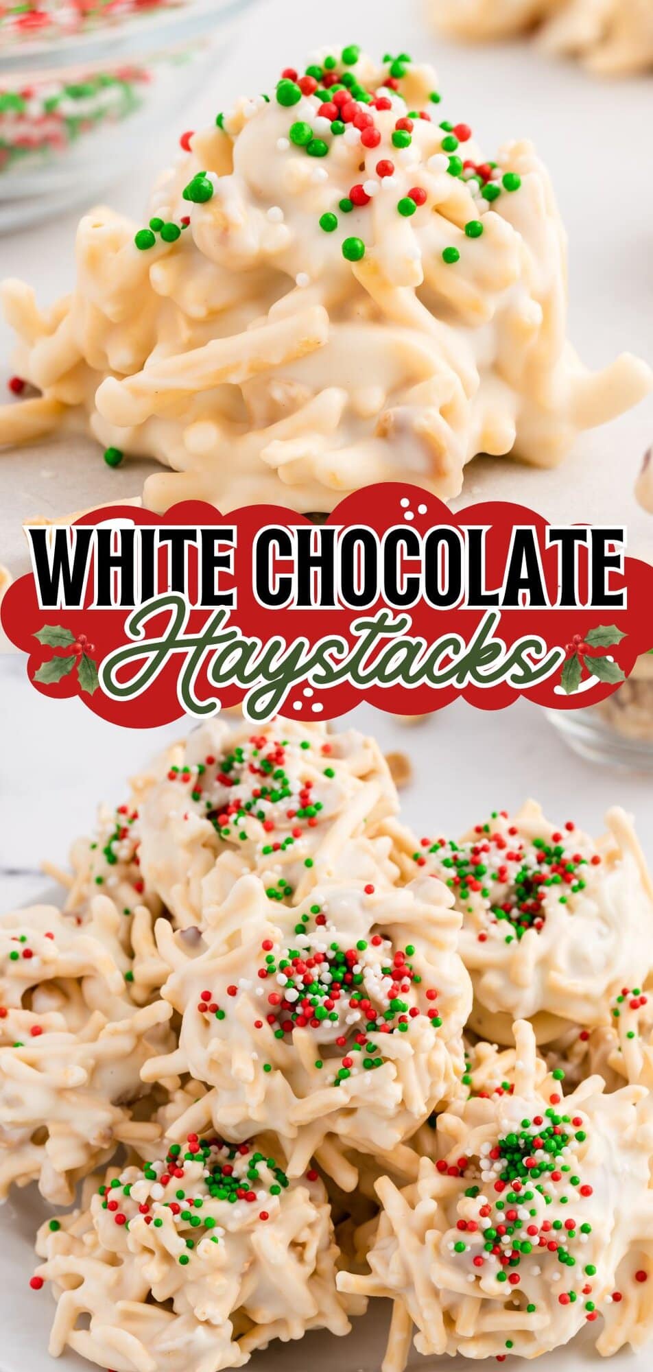 Our White Chocolate Haystack candy recipe is so quick and easy to make simply by dropping spoonfuls of chocolate-covered noodles and nuts onto parchment paper and then sprinkling the haystack candy piles with nonpareils.
